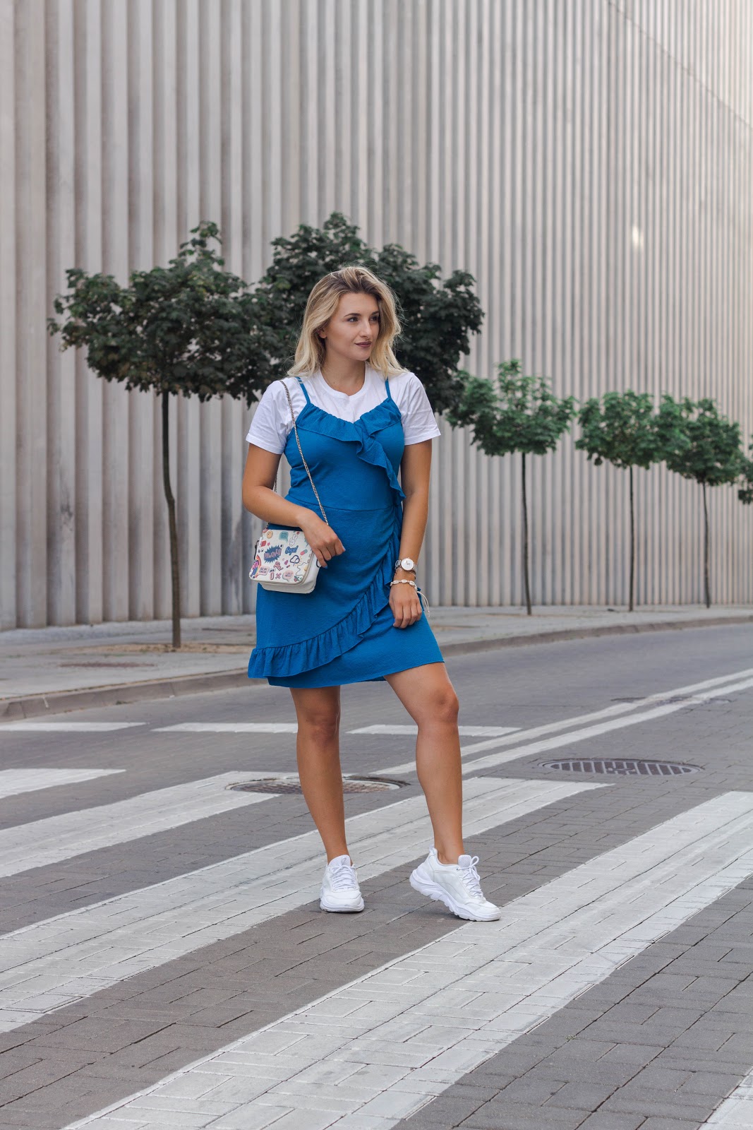 What do you think about combining a dress with sneakers? I must admit that I feel very comfortable in such a combination. You can find a blue dress, perfect for summer evenings in a Bonprix. I added a white t-shirt, which in my opinion perfectly enlivens this combination. White sneakers are a classic choice that is the basis of my today's look!